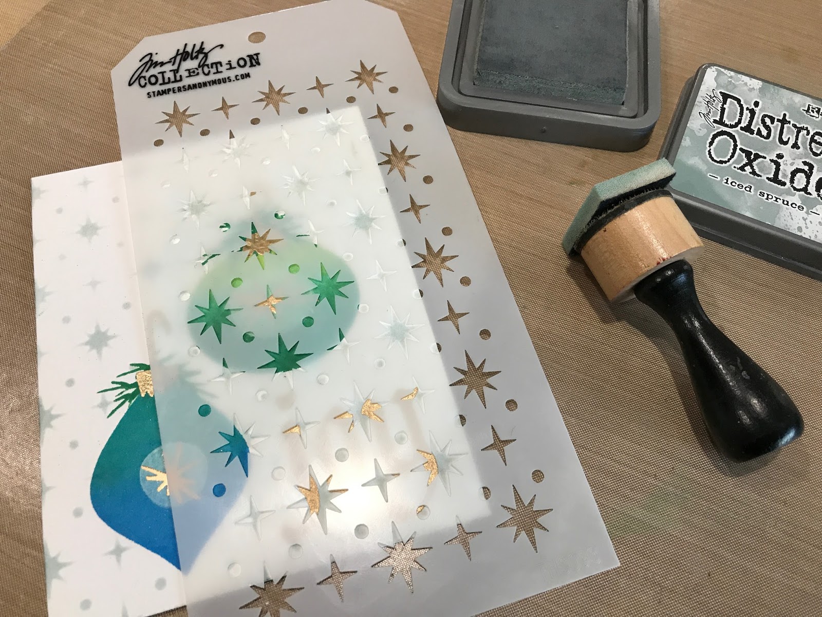 Punch greenery out with the Holly and Juniper Punch. Alcohol ink the greens withGold Metallic Mixative on an Applicator Tool.